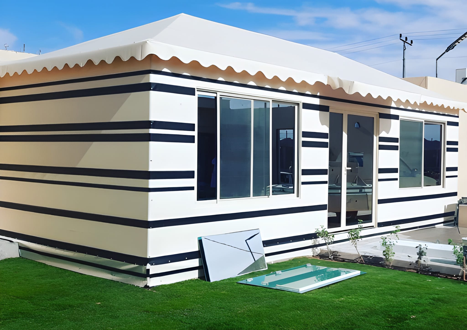 نعيد إحياء التراث العربي الأصيل بروح عصرية فخمة تليق بمقام ضيوفك. تقوم مظلات وسواتر الرياض بتجهيز وبناء بيوت شعر وخيام ملكية متكاملة المواصفات، بدءاً من الهيكل الحديدي المتين المرفوع عن الأرض، وصولاً إلى الديكورات الداخلية التراثية، أقمشة السدو الفاخرة، الإنارة المخفية، والعزل الحراري الكامل للجدران والسقف. اصنع لنفسك ولضيوفك مجلساً يجمع بين عبق التاريخ ورفاهية الحاضر.